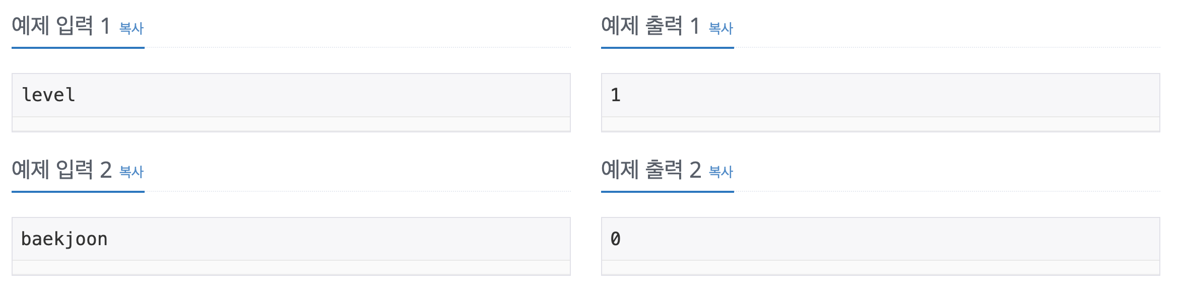 level, noon은 팰린드롬이고, baekjoon, online, judge는 팰린드롬이 아니다.